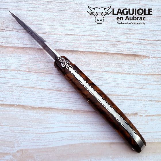 Laguiole en Aubrac - Griff Walnuss-Wurzelholz plein manche - Explosionsdamast - Ziselierte Platine - 12 cm Taschenmesser