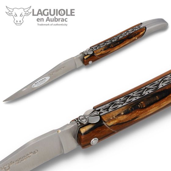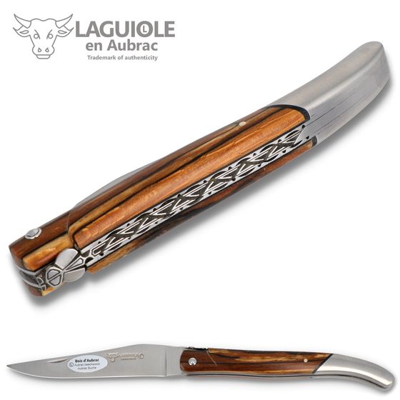 Laguiole en Aubrac UNIKAT - Gestockte Buche - Biene, Feder und Platine von Hand verziert - 12cm Taschenmesser